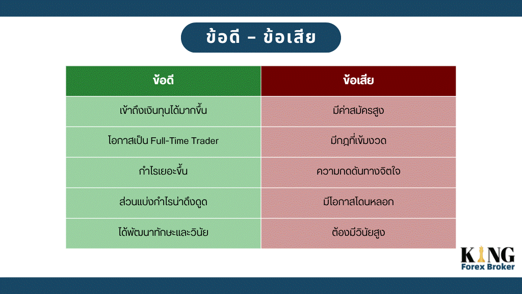 ข้อดีคือทำให้เทรดเดอร์สามารถเข้าถึงเงินทุนได้มากขึ้น ข้อเสียคือมีกฏต่างๆและอาจมีแรงกดดันที่มากขึ้น