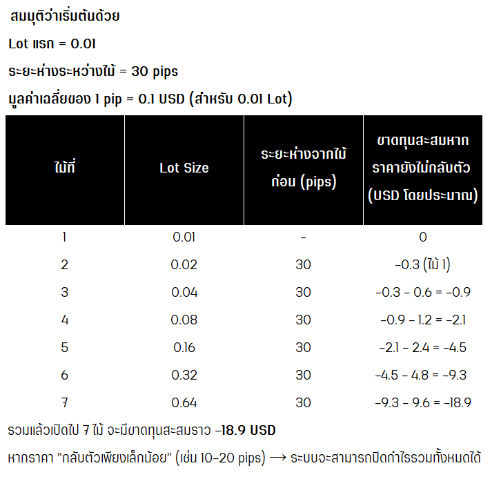 - หากราคา วิ่งผิดทาง จนขาดทุนถึงระดับหนึ่ง (เช่น 30 pips) → ระบบจะ เปิดออเดอร์เพิ่ม โดย ทบ Lot เช่น เพิ่มเป็น 0.02, 0.04, 0.08, 0.16,… ไปเรื่อยๆ