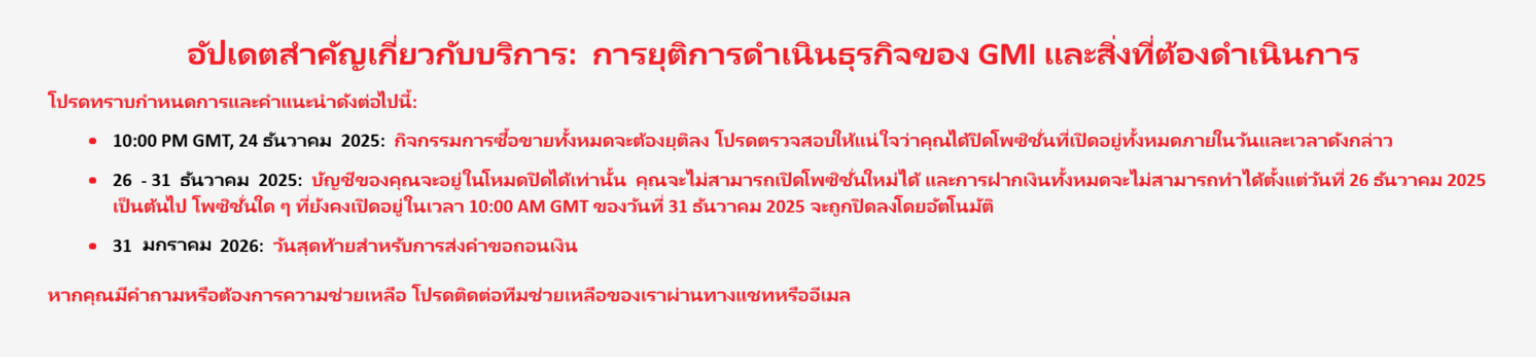 เมื่อวันที่ 17 ธันวาคม 2025 เวลา 20.41 น. ทาง GMI Markets ได้ส่งอีเมลแจ้งลูกค้าในประเทศไทยว่า บริษัทมีแผน ยุติการดำเนินธุรกิจ โดยระบุว่า Global Market Index LLC (SVG) และ GMI Global Market Index Limited (St. Lucia) จะยุติการให้บริการซื้อขายฟอเร็กซ์ทั่วโลก ซึ่งมีผลบังคับใช้กับลูกค้าทุกราย ภายใต้กระบวนการปิดกิจการของบริษัท